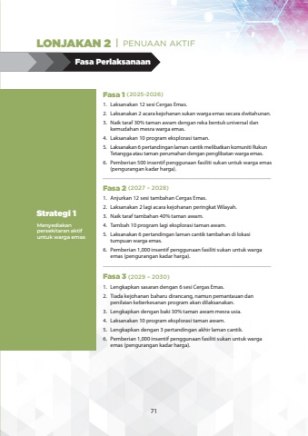 Fasa PerlaksanaanMenyediakanpersekitaran aktif untuk warga emasStrategi 1Fasa 1 (2025-2026)Fasa 2 (2027 %u2013 2028)Fasa 3 (2029 %u2013 2030)1.Laksanakan 12 sesi Cergas Emas.2.Laksanakan 2 acara kejohanan sukan warga emas secara dwitahunan.3.Naik taraf 30% taman awam dengan reka bentuk universal dan kemudahan mesra warga emas.4.Laksanakan 10 program eksplorasi taman.5.Laksanakan 6 pertandingan laman cantik melibatkan komuniti Rukun Tetangga atau taman perumahan dengan penglibatan warga emas.6.Pemberian 500 insentif penggunaan fasiliti sukan untuk warga emas (pengurangan kadar harga).1.Anjurkan 12 sesi tambahan Cergas Emas.2.Laksanakan 2 lagi acara kejohanan peringkat Wilayah.3.Naik taraf tambahan 40% taman awam.4.Tambah 10 program lagi eksplorasi taman awam.5.Laksanakan 6 pertandingan laman cantik tambahan di lokasi tumpuan warga emas.6.Pemberian 1,000 insentif penggunaan fasiliti sukan untuk warga emas (pengurangan kadar harga).1.Lengkapkan sasaran dengan 6 sesi Cergas Emas.2.Tiada kejohanan baharu dirancang, namun pemantauan dan penilaian keberkesanan program akan dilaksanakan.3.Lengkapkan dengan baki 30% taman awam mesra usia.4.Laksanakan 10 program eksplorasi taman awam.5.Lengkapkan dengan 3 pertandingan akhir laman cantik.6.Pemberian 1,000 insentif penggunaan fasiliti sukan untuk warga emas (pengurangan kadar harga).LONJAKAN 2 PENUAAN AKTIF71