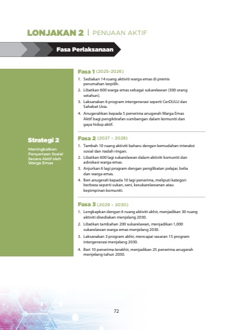 MeningkatkanPenyertaan Sosial Secara Aktif oleh Warga EmasStrategi 2Fasa 1 (2025-2026)Fasa 2 (2027 %u2013 2028)Fasa 3 (2029 %u2013 2030)1.Sediakan 14 ruang aktiviti warga emas di premis perumahan terpilih.2.Libatkan 600 warga emas sebagai sukarelawan (300 orang setahun).3.Laksanakan 6 program intergenerasi seperti CerDULU dan Sahabat Usia.4.Anugerahkan kepada 5 penerima anugerah Warga Emas Aktif bagi pengiktirafan sumbangan dalam komuniti dan gaya hidup aktif.1.Tambah 10 ruang aktiviti baharu dengan kemudahan interaksi sosial dan riadah ringan.2.Libatkan 600 lagi sukarelawan dalam aktiviti komuniti dan advokasi warga emas.3.Anjurkan 6 lagi program dengan penglibatan pelajar, belia dan warga emas.4.Beri anugerah kepada 10 lagi penerima, meliputi kategori berbeza seperti sukan, seni, kesukarelawanan atau kepimpinan komuniti.1.Lengkapkan dengan 6 ruang aktiviti akhir, menjadikan 30 ruang aktiviti disediakan menjelang 2030.2.Libatkan tambahan 200 sukarelawan, menjadikan 1,000 sukarelawan warga emas menjelang 2030.3.Laksanakan 3 program akhir, mencapai sasaran 15 program intergenerasi menjelang 2030.4.Beri 10 penerima terakhir, menjadikan 25 penerima anugerah menjelang tahun 2030.Fasa PerlaksanaanLONJAKAN 2 PENUAAN AKTIF72
