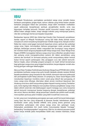 ISUDi Wilayah Persekutuan, peningkatan penduduk warga emas semakin ketara berikutan peningkatan jangka hayat, namun cabaran yang timbul bukan sekadar berkaitan penjagaan fizikal dan perubatan, tetapi lebih mendalam melibatkan aspek psikososial, kesejahteraan spiritual, pengiktirafan kendiri, serta rasa kepunyaan terhadap komuniti. Penuaan positif menuntut supaya warga emas dilihat bukan sebagai beban, tetapi sebagai individu yang mempunyai potensi, nilai dan sumbangan berterusan kepada masyarakat.Berdasarkan laporan WHO dan Global Age-Friendly Cities Framework, persekitaran bandar seperti di Wilayah Persekutuan sering kali tidak direka bentuk secara menyeluruh untuk menyokong kesejahteraan holistik warga emas. Banyak struktur fizikal dan sistem sosial gagal memenuhi keperluan emosi, spiritual dan psikologi warga emas. Kajian menunjukkan bahawa pengasingan sosial, perasaan tidak dihargai, kehilangan peranan dalam masyarakat dan kurangnya ruang ekspresi diri memberi kesan langsung kepada kualiti hidup warga emas. Dasar Warga Emas Negara (DWEN) menegaskan bahawa warga emas harus diberikan penghormatan dan peluang untuk mengoptimumkan potensi diri dalam persekitaran yang selamat dan kondusif. Ini termasuk peluang untuk menyumbang dalam bentuk bukan formal seperti perkongsian nilai, penjagaan cucu dan aktiviti komuniti. Namun begitu, akses terhadap program-program ini masih terhad terutamanya bagi golongan warga emas yang tinggal bersendirian, berpendapatan rendah atau kurang jaringan sokongan kekeluargaan.Menurut Pelan Tindakan Perkhidmatan Kesihatan Warga Emas (PTPKWE 2023%u20132030), pendekatan kesihatan warga emas perlu beralih daripada sekadar rawatan klinikal kepada pendekatan yang menyeluruh dan holistik, termasuk intervensi psikososial dan peningkatan kualiti hidup seharian. Di samping itu, Dasar Sosial Negara 2030 menekankan keperluan membina sistem sosial yang inklusif dan penyayang, di mana warga emas dihargai, disertakan dalam proses membuat keputusan dan disokong untuk terus aktif menyumbang dalam kapasiti masing-masing. Tambahan pula, Active Ageing Index Malaysia menunjukkan bahawa penglibatan warga emas dalam aktiviti sosial dan nilai kekeluargaan seperti menjaga cucu serta menyertai aktiviti komuniti mempunyai korelasi langsung dengan kesejahteraan psikologi dan emosi. Namun demikian, tahap penyertaan sukarela dan politik masih rendah, menunjukkan perlunya pelan tindakan yang lebih inovatif dan mesra usia.Isu lain yang turut menghalang pencapaian penuaan positif termasuk kekurangan ruang hijau dan biru yang terapeutik di kawasan bandar, keterbatasan aktiviti kerohanian awam yang bersifat reflektif, serta jurang antara generasi yang melemahkan perkongsian nilai antara warga emas dan golongan muda. Kebanyakan pendekatan kini masih terlalu menumpukan kepada %u201cmenjaga%u201d berbanding %u201cmendayaupayakan%u201d warga emas. Oleh itu, isu sebenar penuaan positif bukan hanya terletak pada menyediakan fasiliti atau rawatan kesihatan, tetapi LONJAKAN 3 PENUAAN POSITIF78