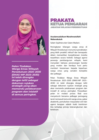 Assalamualaikum Warahmatullahi WabarakatuhSalam Sejahtera dan Salam Madani.Peningkatan bilangan warga emas di Wilayah Persekutuan menuntut pendekatan yang lebih proaktif, inklusif dan bersepadu dalam memastikan kesejahteraan mereka terpelihara secara holistik. Sebagai agensi peneraju pembangunan wilayah, kami menyedari bahawa perancangan bandar yang moden dan berdaya huni perlu memberi keutamaan kepada keperluan warga emas yang semakin kompleks dan pelbagai.Pelan Tindakan Warga Emas Wilayah Persekutuan 2025%u20132030 (EMAS-WP 2025%u20132030) ini telah dirangka dengan teliti sebagai dokumen rujukan strategik yang akan memandu pelaksanaan program dan inisiatif di semua peringkat. Penyediaan pelan ini melalui proses libat urus menyeluruh bersama pelbagai pemegang taruh termasuk komuniti warga emas, pakar akademik, pertubuhan masyarakat sivil dan agensi kerajaan adalah bukti komitmen kita terhadap prinsip keterangkuman dan ketelusan.PRAKATAKETUA PENGARAHJABATAN WILAYAH PERSEKUTUANPelan Tindakan Warga Emas Wilayah Persekutuan 2025%u20132030 (EMAS-WP 2025%u20132030) ini telah dirangka dengan teliti sebagai dokumen rujukan strategik yang akan memandu pelaksanaan program dan inisiatif di semua peringkat.viii