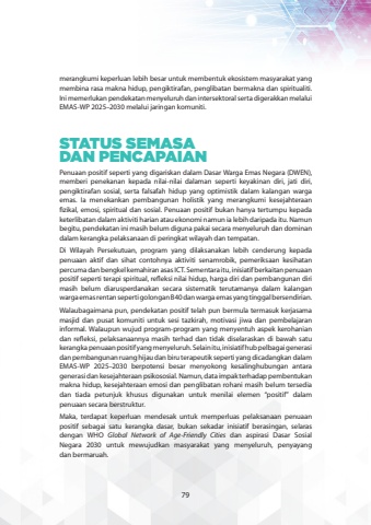 STATUS SEMASA DAN PENCAPAIANPenuaan positif seperti yang digariskan dalam Dasar Warga Emas Negara (DWEN), memberi penekanan kepada nilai-nilai dalaman seperti keyakinan diri, jati diri, pengiktirafan sosial, serta falsafah hidup yang optimistik dalam kalangan warga emas. Ia menekankan pembangunan holistik yang merangkumi kesejahteraan fizikal, emosi, spiritual dan sosial. Penuaan positif bukan hanya tertumpu kepada keterlibatan dalam aktiviti harian atau ekonomi namun ia lebih daripada itu. Namun begitu, pendekatan ini masih belum diguna pakai secara menyeluruh dan dominan dalam kerangka pelaksanaan di peringkat wilayah dan tempatan.Di Wilayah Persekutuan, program yang dilaksanakan lebih cenderung kepada penuaan aktif dan sihat contohnya aktiviti senamrobik, pemeriksaan kesihatan percuma dan bengkel kemahiran asas ICT. Sementara itu, inisiatif berkaitan penuaan positif seperti terapi spiritual, refleksi nilai hidup, harga diri dan pembangunan diri masih belum diarusperdanakan secara sistematik terutamanya dalam kalangan warga emas rentan seperti golongan B40 dan warga emas yang tinggal bersendirian.Walaubagaimana pun, pendekatan positif telah pun bermula termasuk kerjasama masjid dan pusat komuniti untuk sesi tazkirah, motivasi jiwa dan pembelajaran informal. Walaupun wujud program-program yang menyentuh aspek kerohanian dan refleksi, pelaksanaannya masih terhad dan tidak diselaraskan di bawah satu kerangka penuaan positif yang menyeluruh. Selain itu, inisiatif hub pelbagai generasi dan pembangunan ruang hijau dan biru terapeutik seperti yang dicadangkan dalam EMAS-WP 2025%u20132030 berpotensi besar menyokong kesalinghubungan antara generasi dan kesejahteraan psikososial. Namun, data impak terhadap pembentukan makna hidup, kesejahteraan emosi dan penglibatan rohani masih belum tersedia dan tiada petunjuk khusus digunakan untuk menilai elemen %u201cpositif%u201d dalam penuaan secara berstruktur.Maka, terdapat keperluan mendesak untuk memperluas pelaksanaan penuaan positif sebagai satu kerangka dasar, bukan sekadar inisiatif berasingan, selaras dengan WHO Global Network of Age-Friendly Cities dan aspirasi Dasar Sosial Negara 2030 untuk mewujudkan masyarakat yang menyeluruh, penyayang dan bermaruah.merangkumi keperluan lebih besar untuk membentuk ekosistem masyarakat yang membina rasa makna hidup, pengiktirafan, penglibatan bermakna dan spiritualiti. Ini memerlukan pendekatan menyeluruh dan intersektoral serta digerakkan melalui EMAS-WP 2025%u20132030 melalui jaringan komuniti.79