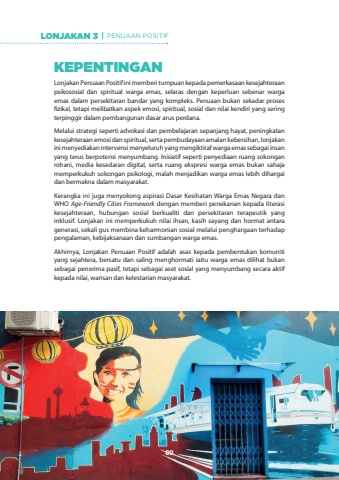 KEPENTINGANLonjakan Penuaan Positif ini memberi tumpuan kepada pemerkasaan kesejahteraan psikososial dan spiritual warga emas, selaras dengan keperluan sebenar warga emas dalam persekitaran bandar yang kompleks. Penuaan bukan sekadar proses fizikal, tetapi melibatkan aspek emosi, spiritual, sosial dan nilai kendiri yang sering terpinggir dalam pembangunan dasar arus perdana.Melalui strategi seperti advokasi dan pembelajaran sepanjang hayat, peningkatan kesejahteraan emosi dan spiritual, serta pembudayaan amalan kebersihan, lonjakan ini menyediakan intervensi menyeluruh yang mengiktiraf warga emas sebagai insan yang terus berpotensi menyumbang. Inisiatif seperti penyediaan ruang sokongan rohani, media kesedaran digital, serta ruang ekspresi warga emas bukan sahaja memperkukuh sokongan psikologi, malah menjadikan warga emas lebih dihargai dan bermakna dalam masyarakat.Kerangka ini juga menyokong aspirasi Dasar Kesihatan Warga Emas Negara dan WHO Age-Friendly Cities Framework dengan memberi penekanan kepada literasi kesejahteraan, hubungan sosial berkualiti dan persekitaran terapeutik yang inklusif. Lonjakan ini memperkukuh nilai ihsan, kasih sayang dan hormat antara generasi, sekali gus membina keharmonian sosial melalui penghargaan terhadap pengalaman, kebijaksanaan dan sumbangan warga emas.Akhirnya, Lonjakan Penuaan Positif adalah asas kepada pembentukan komuniti yang sejahtera, bersatu dan saling menghormati iaitu warga emas dilihat bukan sebagai penerima pasif, tetapi sebagai aset sosial yang menyumbang secara aktif kepada nilai, warisan dan kelestarian masyarakat.LONJAKAN 3 PENUAAN POSITIF80