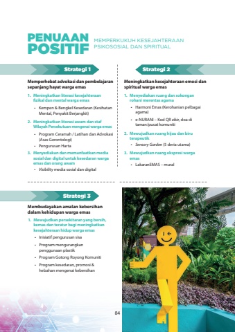 PENUAANPOSITIFMEMPERKUKUH KESEJAHTERAANPSIKOSOSIAL DAN SPIRITUALStrategi 1Strategi 3Strategi 2Memperhebat advokasi dan pembelajaran sepanjang hayat warga emasMembudayakan amalan kebersihan dalam kehidupan warga emasMeningkatkan kesejahteraan emosi dan spiritual warga emas1.Meningkatkan literasi kesejahteraan fizikal dan mental warga emas%u2022Kempen & Bengkel Kesedaran (Kesihatan Mental, Penyakit Berjangkit)2.Meningkatkan literasi awam dan staf Wilayah Persekutuan mengenai warga emas%u2022Program Ceramah / Latihan dan Advokasi (Asas Gerontologi)%u2022Pengurusan Harta3.Menyediakan dan memanfaatkan media sosial dan digital untuk kesedaran warga emas dan orang awam%u2022Visibility media sosial dan digital1.Mewujudkan persekitaran yang bersih, kemas dan teratur bagi meningkatkan kesejahteraan hidup warga emas%u2022Inisiatif pengurusan sisa%u2022Program mengurangkan penggunaan plastik%u2022Program Gotong Royong Komuniti%u2022Program kesedaran, promosi & hebahan mengenai kebersihan1.Menyediakan ruang dan sokongan rohani merentas agama%u2022Harmoni Emas (Kerohanian pelbagai agama)%u2022e-NURANI %u2013 Kod QR zikir, doa di taman/pusat komuniti2.Mewujudkan ruang hijau dan biru terapeutik%u2022Sensory Garden (5 deria utama)3.Mewujudkan ruang ekspresi warga emas%u2022LakaranEMAS %u2013 mural84